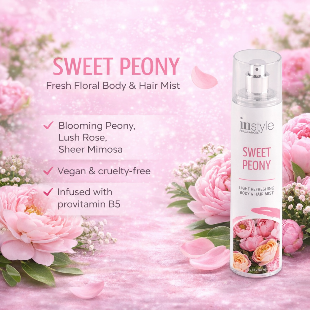 Indulge in the soft elegance of Sweet Peony Body & Hair Mist by InStyle Fragrances, a delicate floral fragrance designed to refresh both skin and hair with a light, feminine scent. This airy mist captures the beauty of blooming florals, blending lush pink peony petals with soft cotton blossoms and creamy musk for a fragrance that feels romantic, clean, and effortlessly wearable.